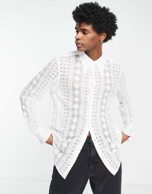 ASOS DESIGN Kanten overhemd met jaren 70 kraag en ronde zoom in wit WHITE ASOS View larger